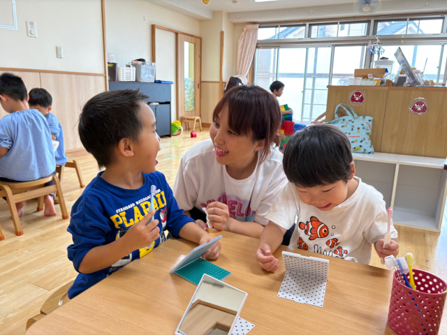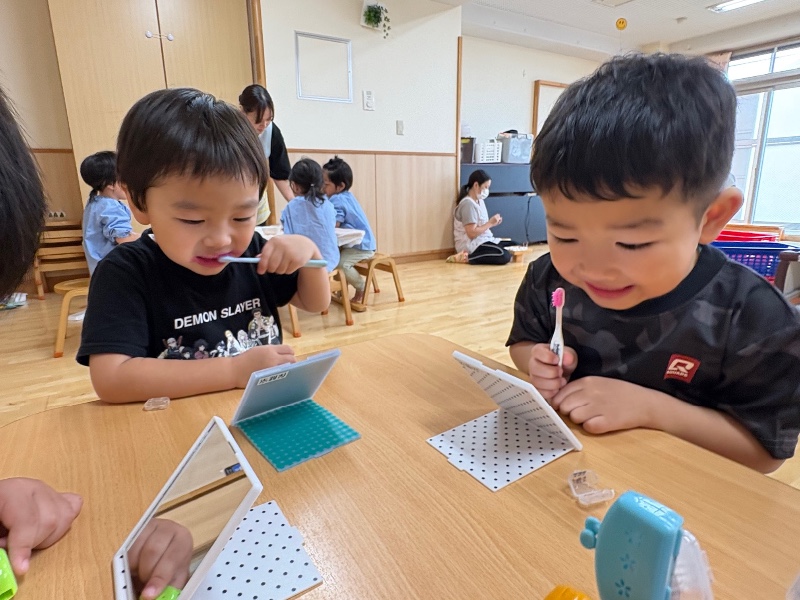 写真館 歯磨き指導(にじ組) 2025/10/07 看護師が紙芝居やプラークチェッカーを使い、歯磨き指導を行いました。 鏡に向かって大きく口を開けてプラークチェッカーで赤く染まった歯が白くなるよう隅々まで磨きました。 << 一覧に戻る