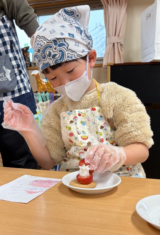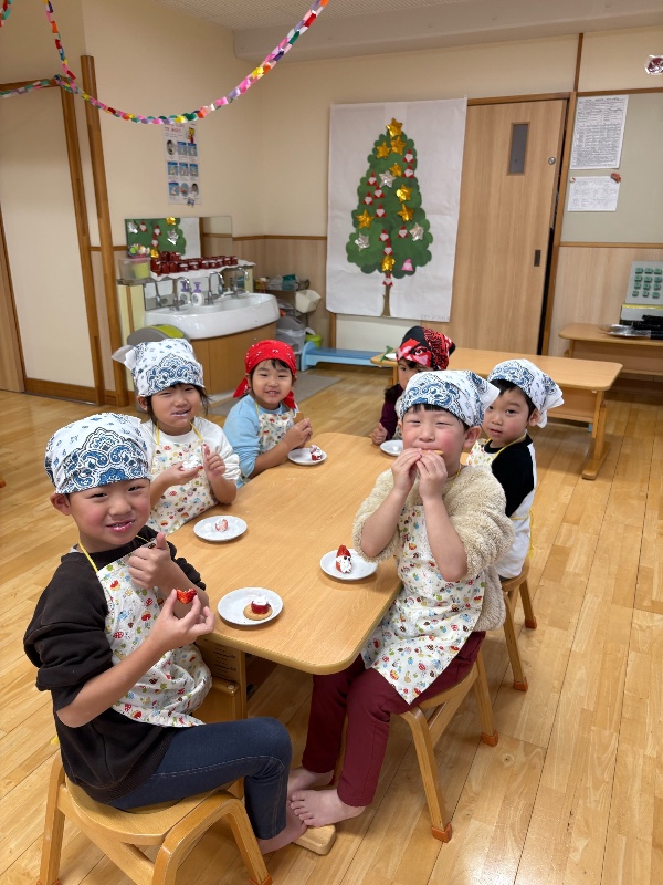 写真館 イチゴのサンタクロース(つき組) 2025/12/24 八百屋にイチゴを買いに行きました。 イチゴを包丁で切り、クリームやマシュマロをはさみチョコチップで目をつけイチゴのサンタクロースを作りました。 << 一覧に戻る