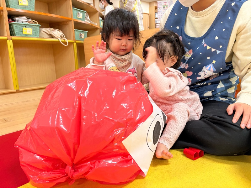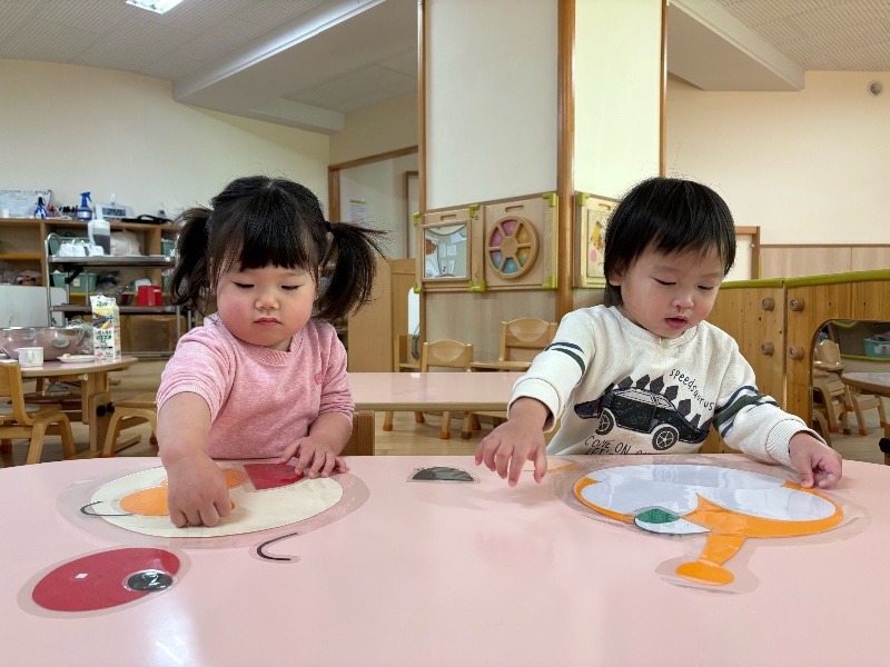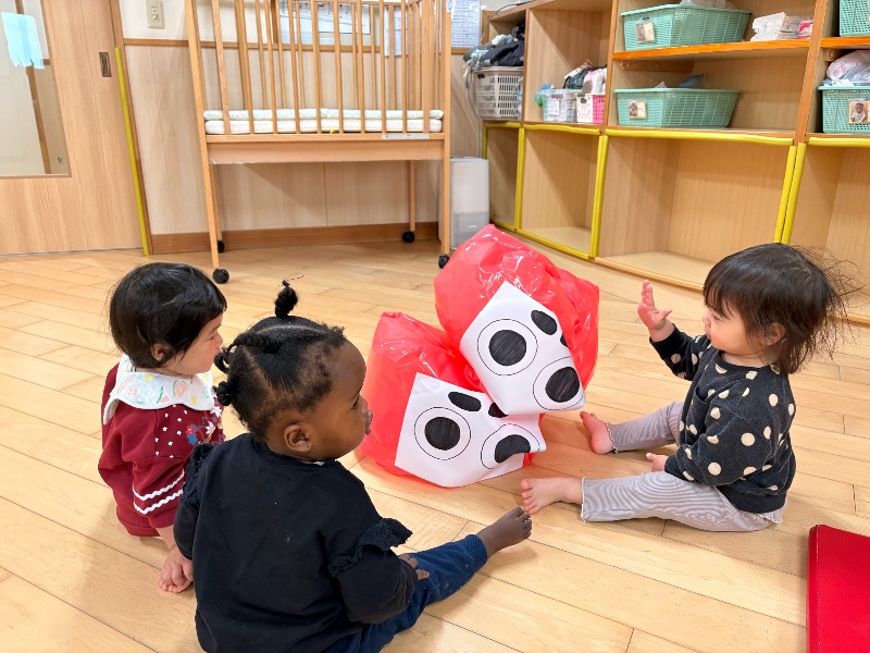 ふたば組はだるまを持ち上げたり、叩いて落として遊びました。 もり組は目や口などのパーツを置いて福笑いで遊びました。