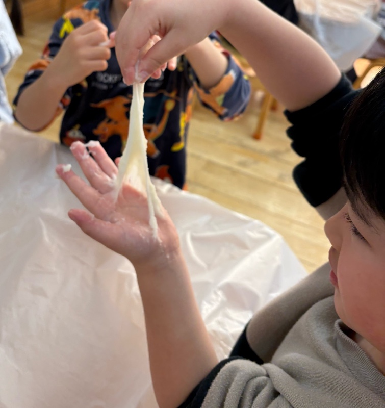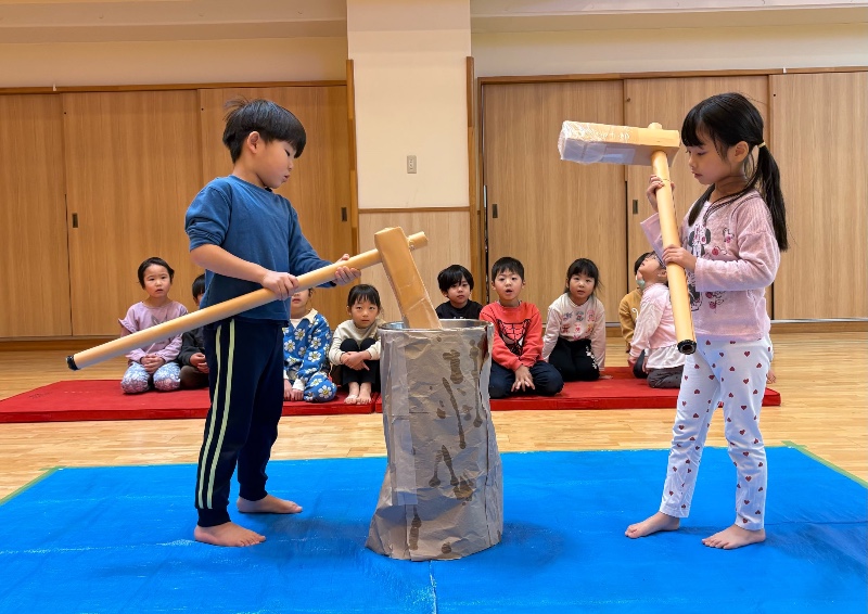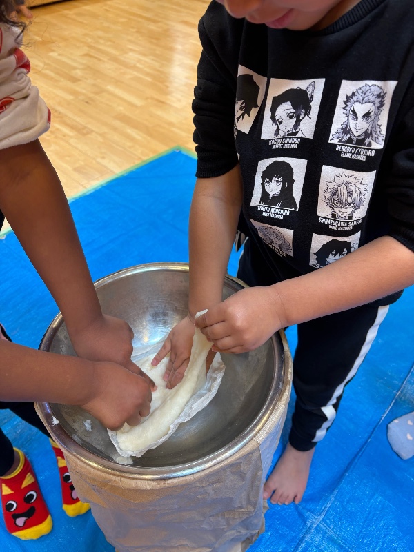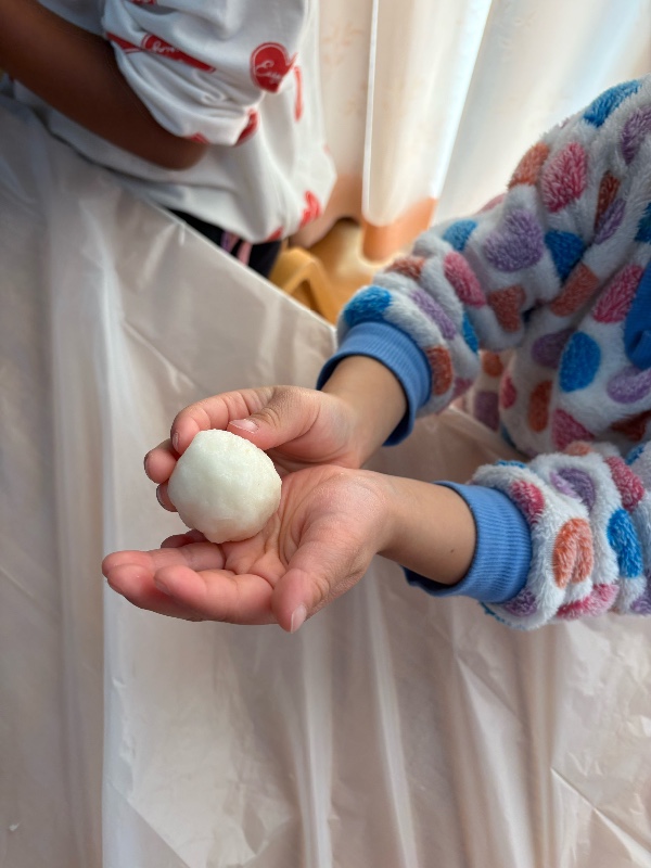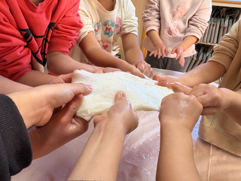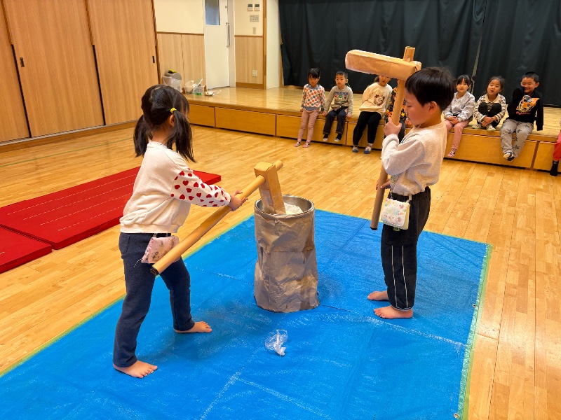 にじ・つき・ほし組でお餅つきをしました。 ついたお餅に触れて感触を確かめながら遊びました。