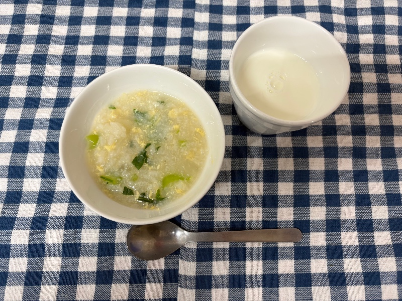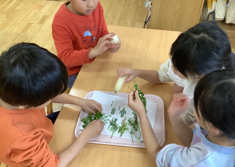 七草がゆの由来やクイズをしました。 その後、実物にも触れました。 おやつで七草がゆを食べました。
