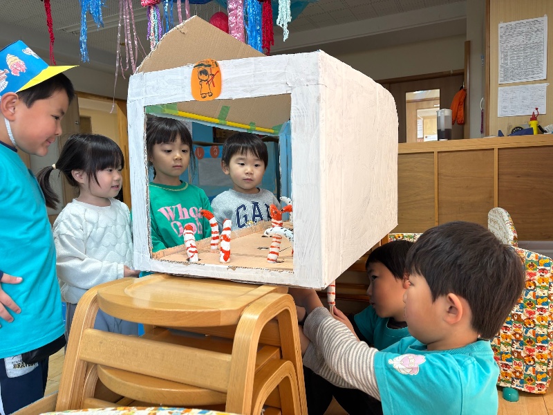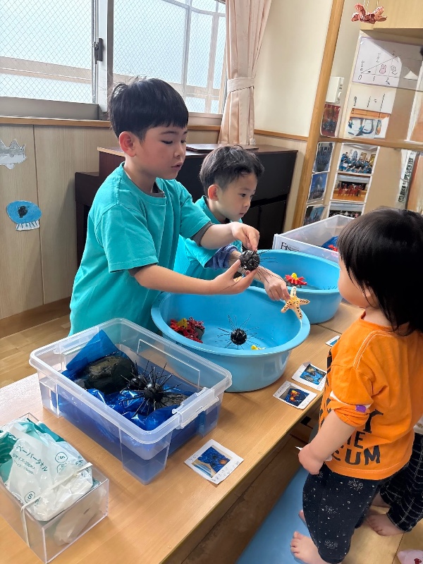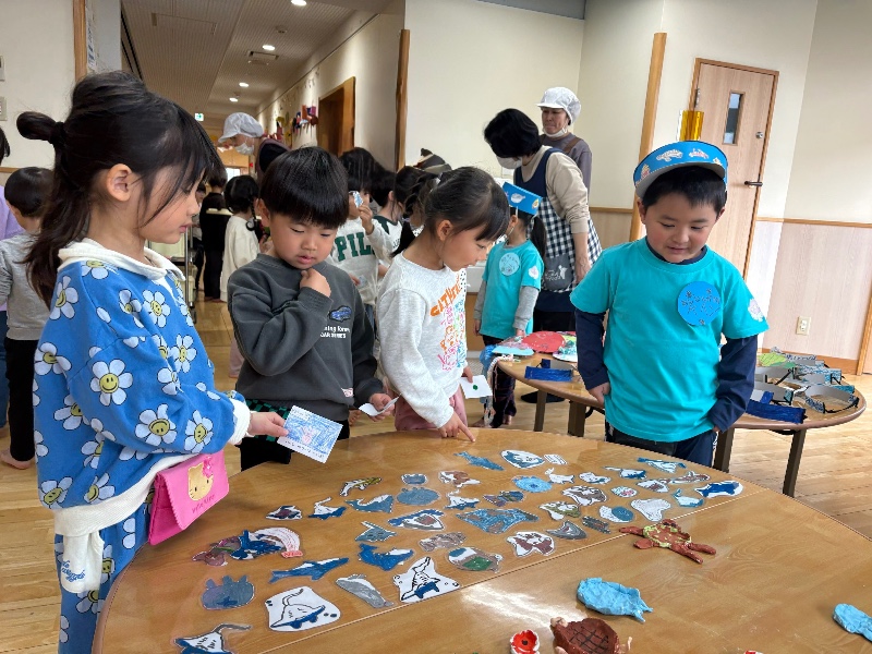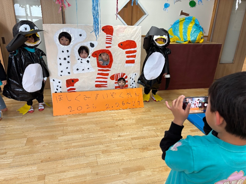 11月の園外保育で行ったすみだ水族館を参考にして、ほし組水族館を開催しました。他のクラスの人はお客さんとして参加しました。