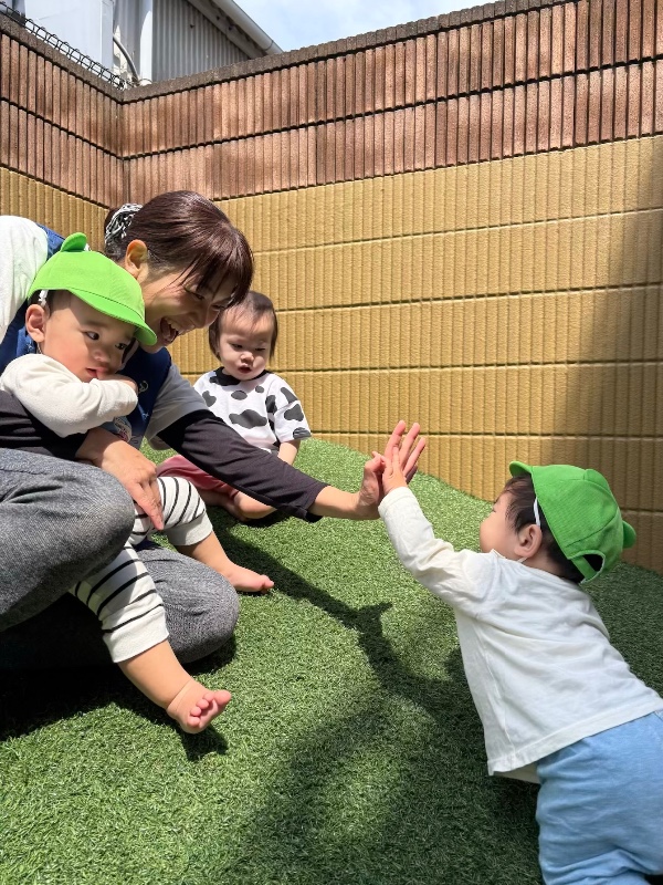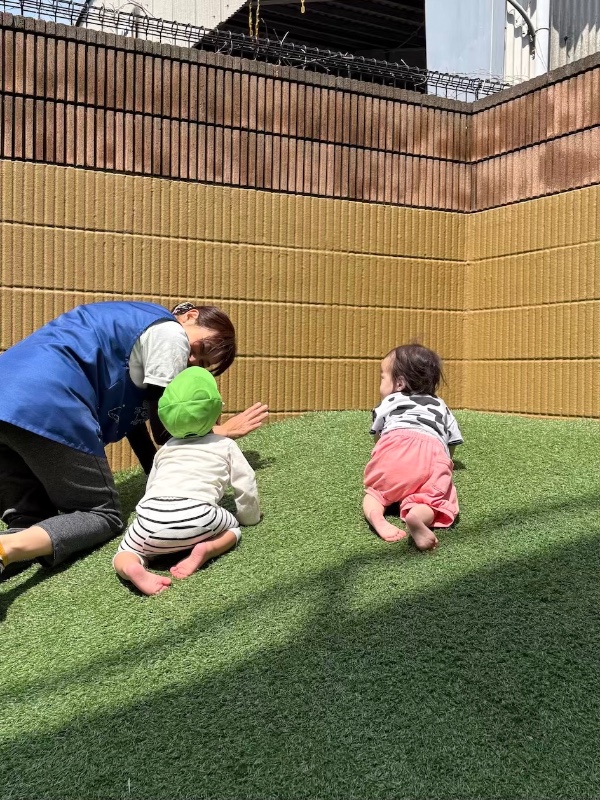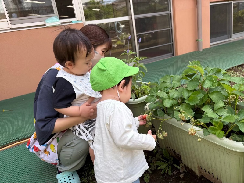 プランターの苺に手を伸ばしたり、芝山をハイハイで登って遊びました。